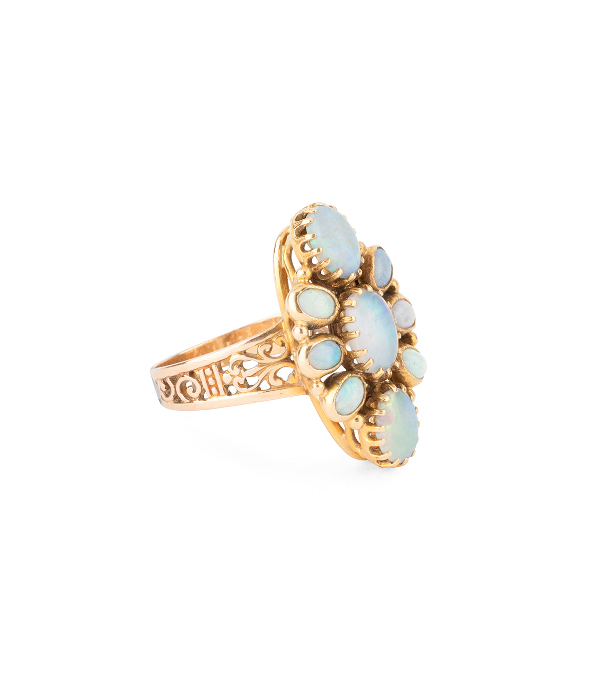 Bague ancienne en or 18 carats (750 millièmes) de la fin du 19ème sièce. Son plateau, de forme ovale, est orné de cabochons d'opales. Les trois centraux, de forme ovale, sont sertis griffe. Ils sont épaulés à chaque extrémité de trois petits cabochons ovales, dipsosés en rayonnement en serti clos. A noter les épaulements joliment décorés.