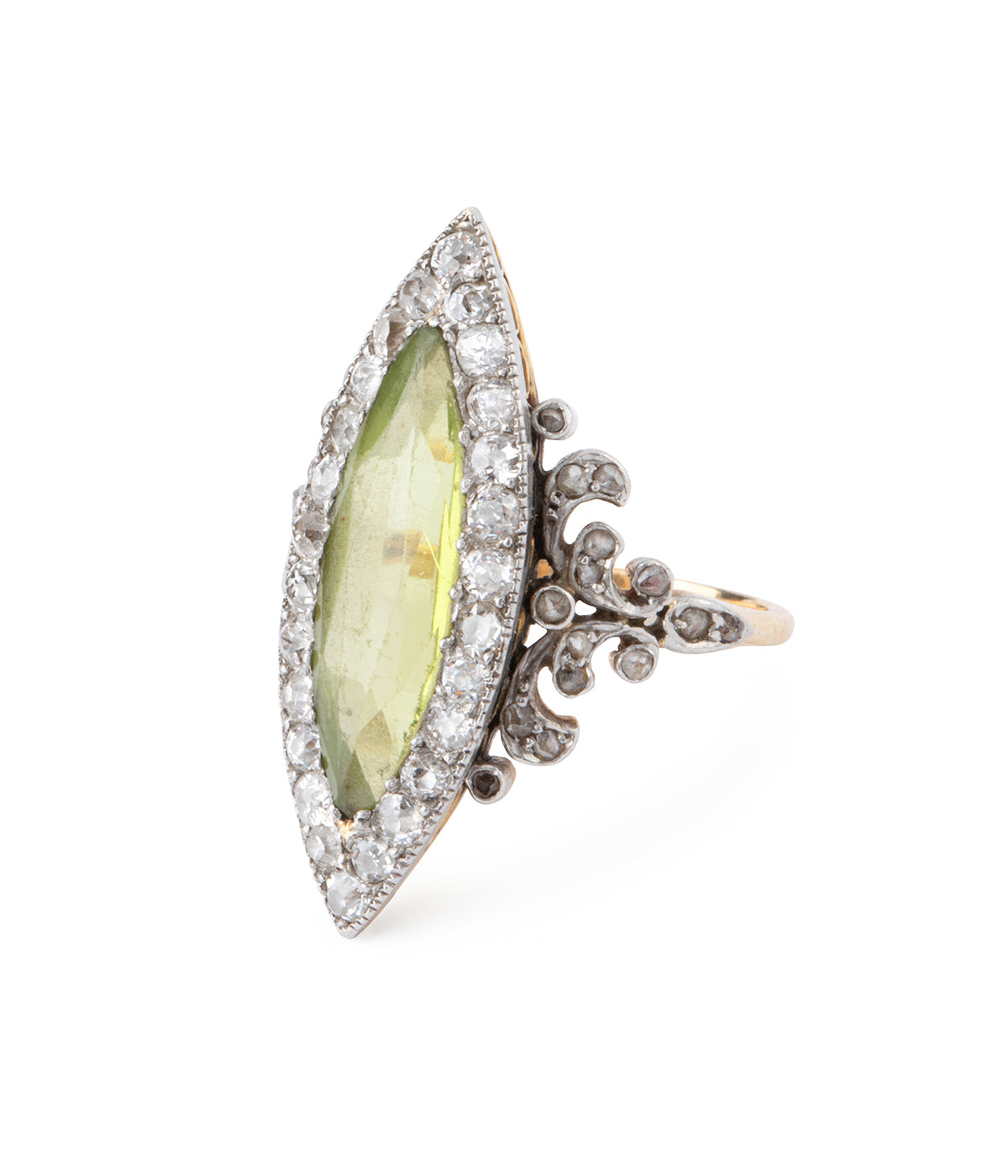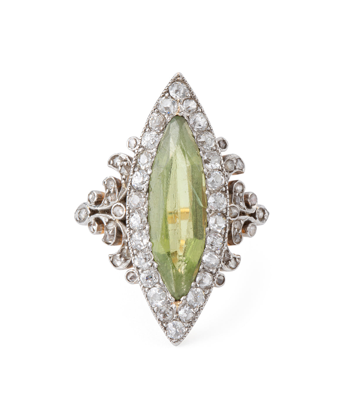 Bague Marquise ancienne en or 18 carats (750 millièmes) du début du 20ème siècle, centrée d'un spinelle taillé en marquise, entouré d'une ligne de diamants taille ancienne. Les épaulements sont ornés de motifs végétaux diamantés de taille rose.