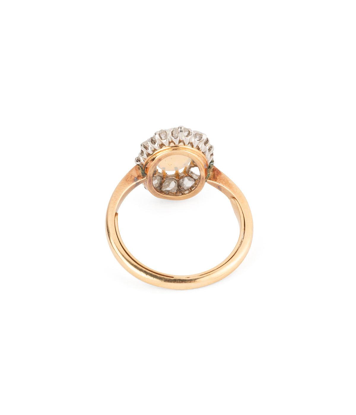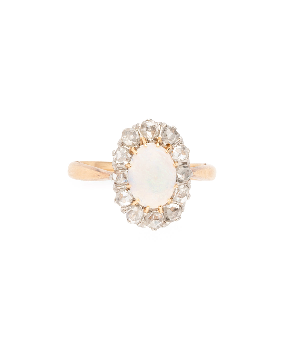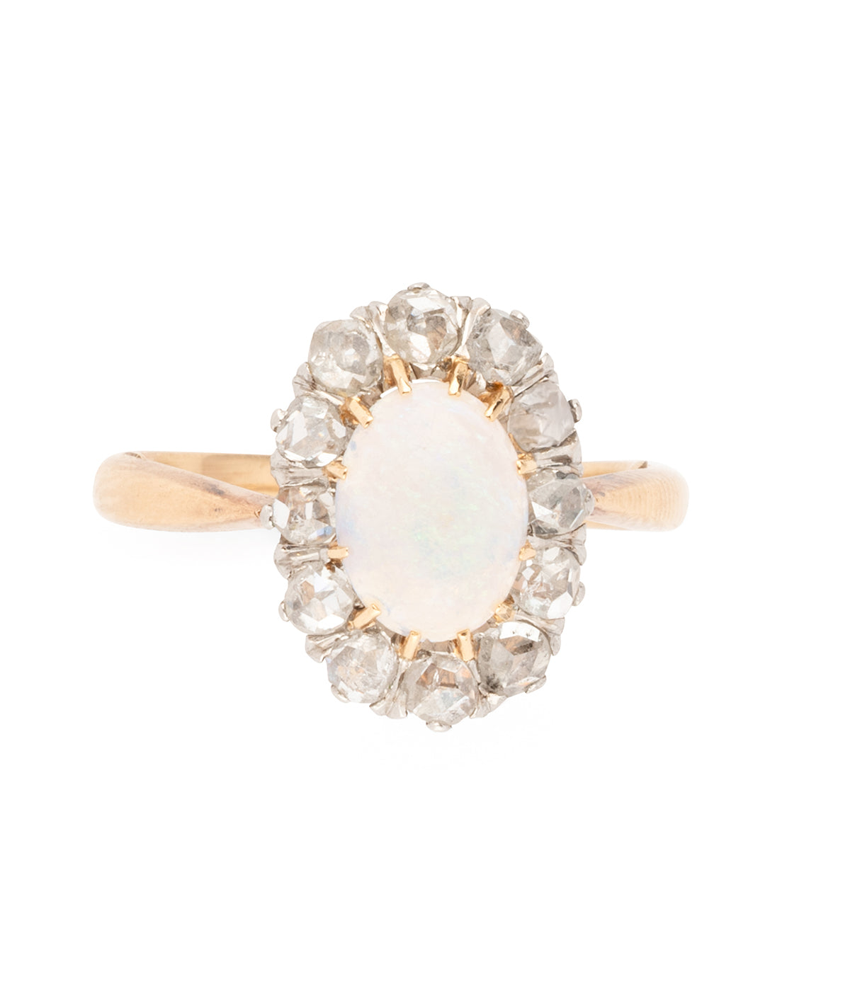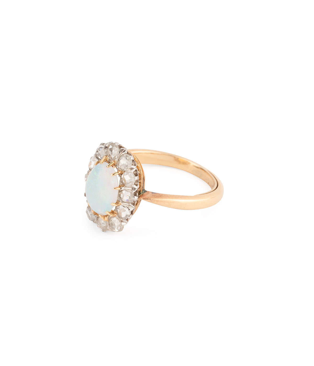 Bague Pompadour ancienne en or 18 carats (750 millièmes) du début du 20ème siècle, ornée d’un cabochon ovale d'opale d'env. 0,75 carat entouré de diamants taille rose.