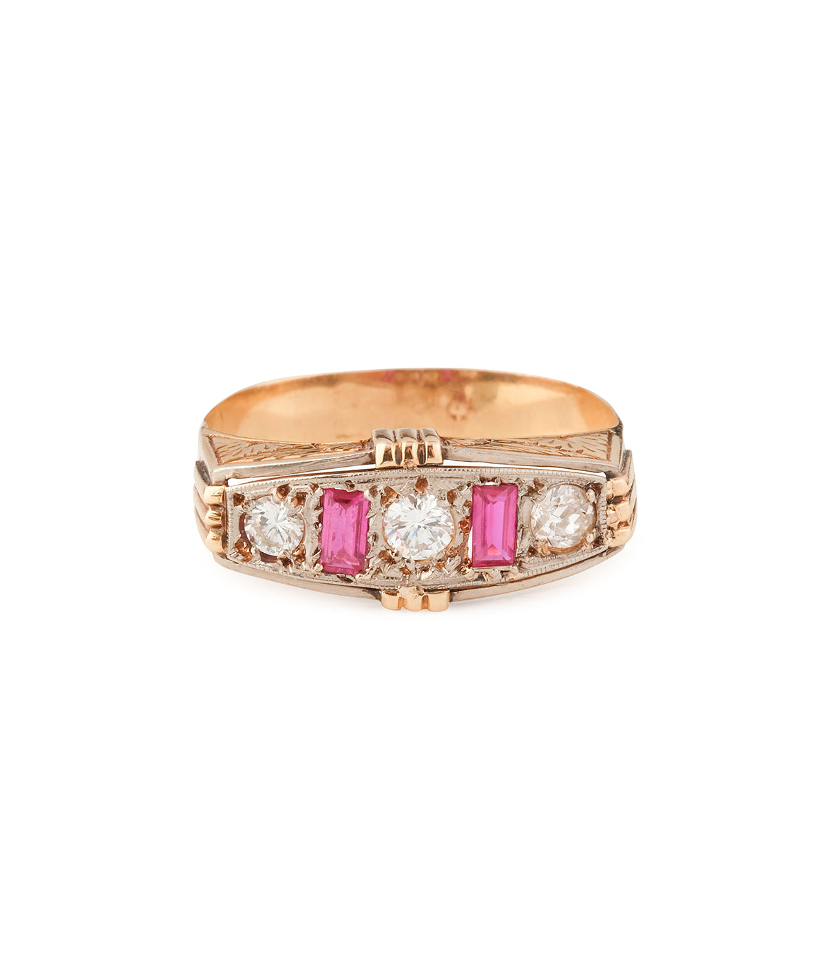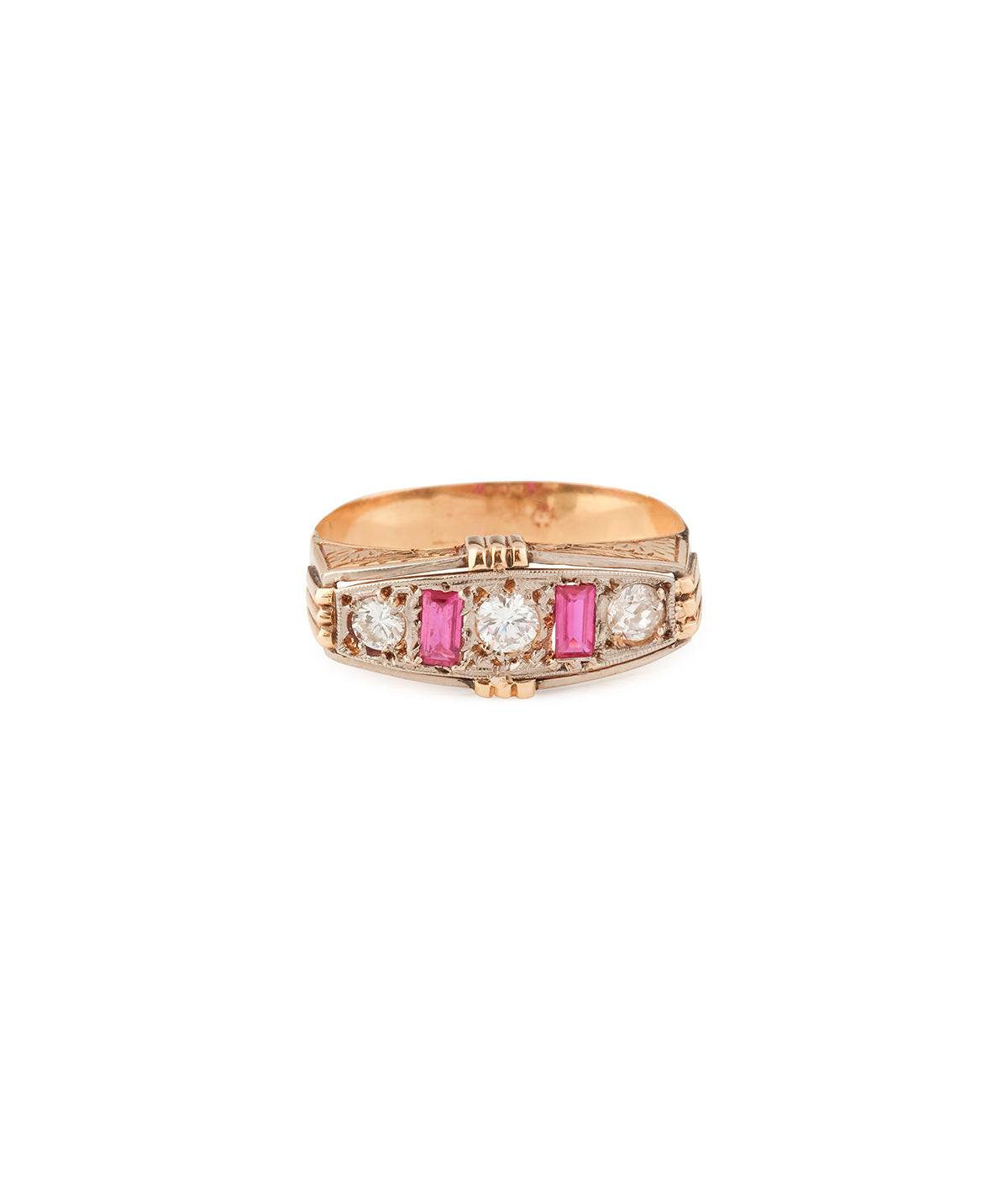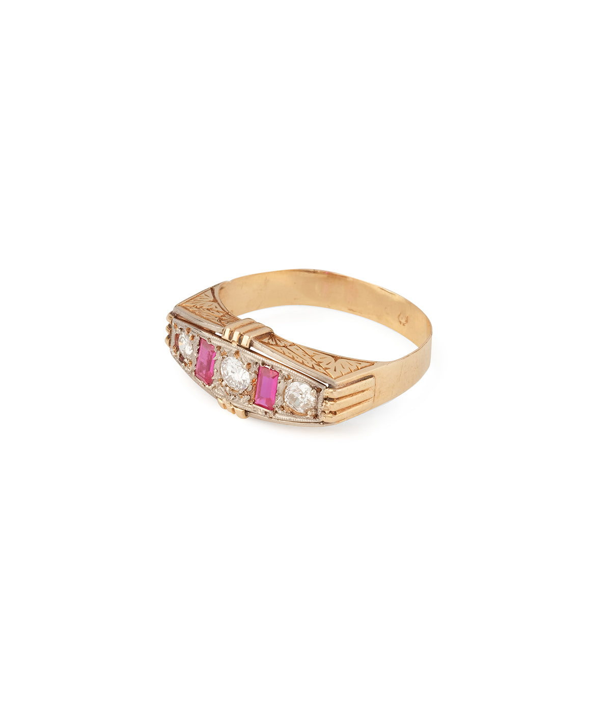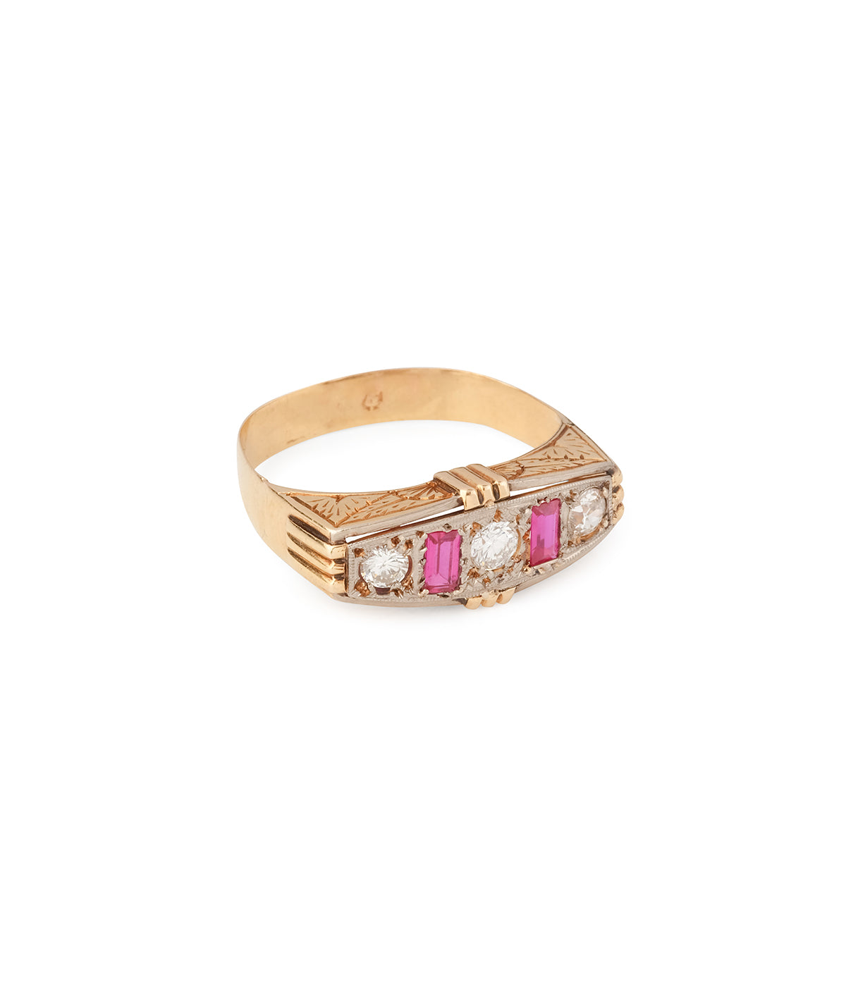 Bague Art déco en or jaune 18 carats (750 millièmes). De style jarretière, elle est ornée de deux rubis synthétiques taille baguette et de trois diamants, deux taille brillant d'env. 0,10 et 0,20 et l'autre taille ancienne d'env. 0,15.