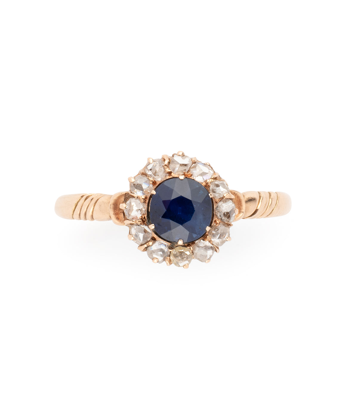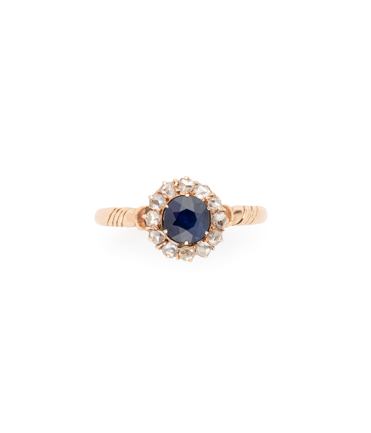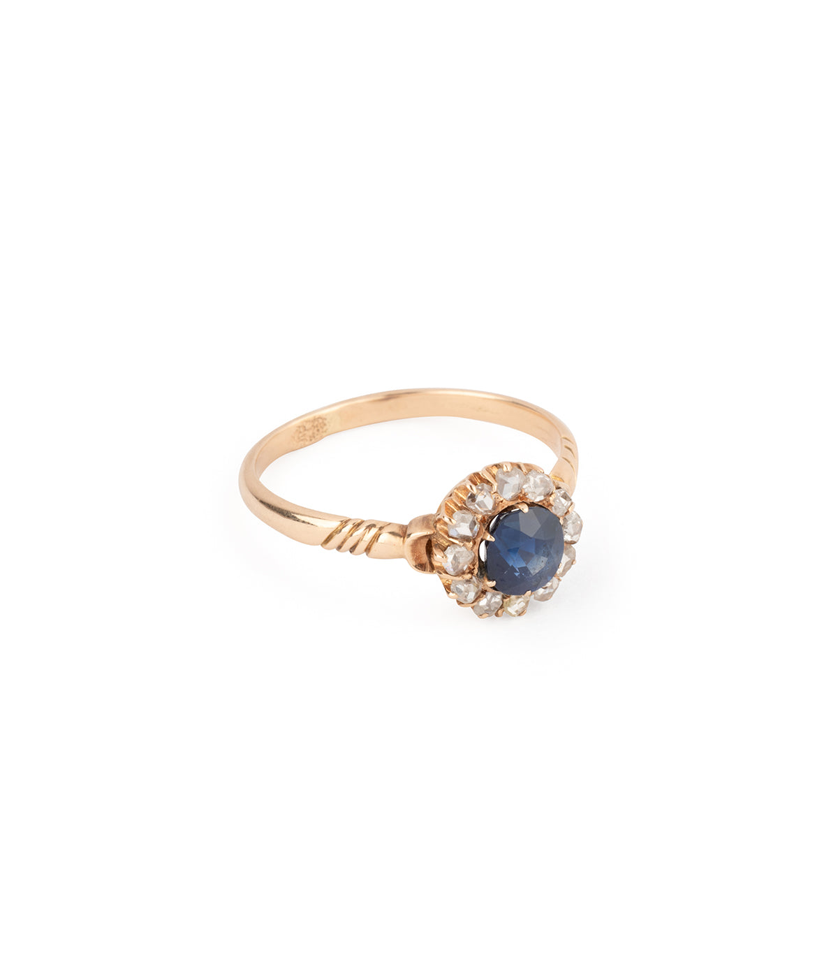 Bague Marguerite ancienne en or rose 14 carats (585 carats) de la fin du 19ème siècle. Elle est centrée d'un saphir synthétique d'env.0,90 carat dans un entourage de diamants taille rose.