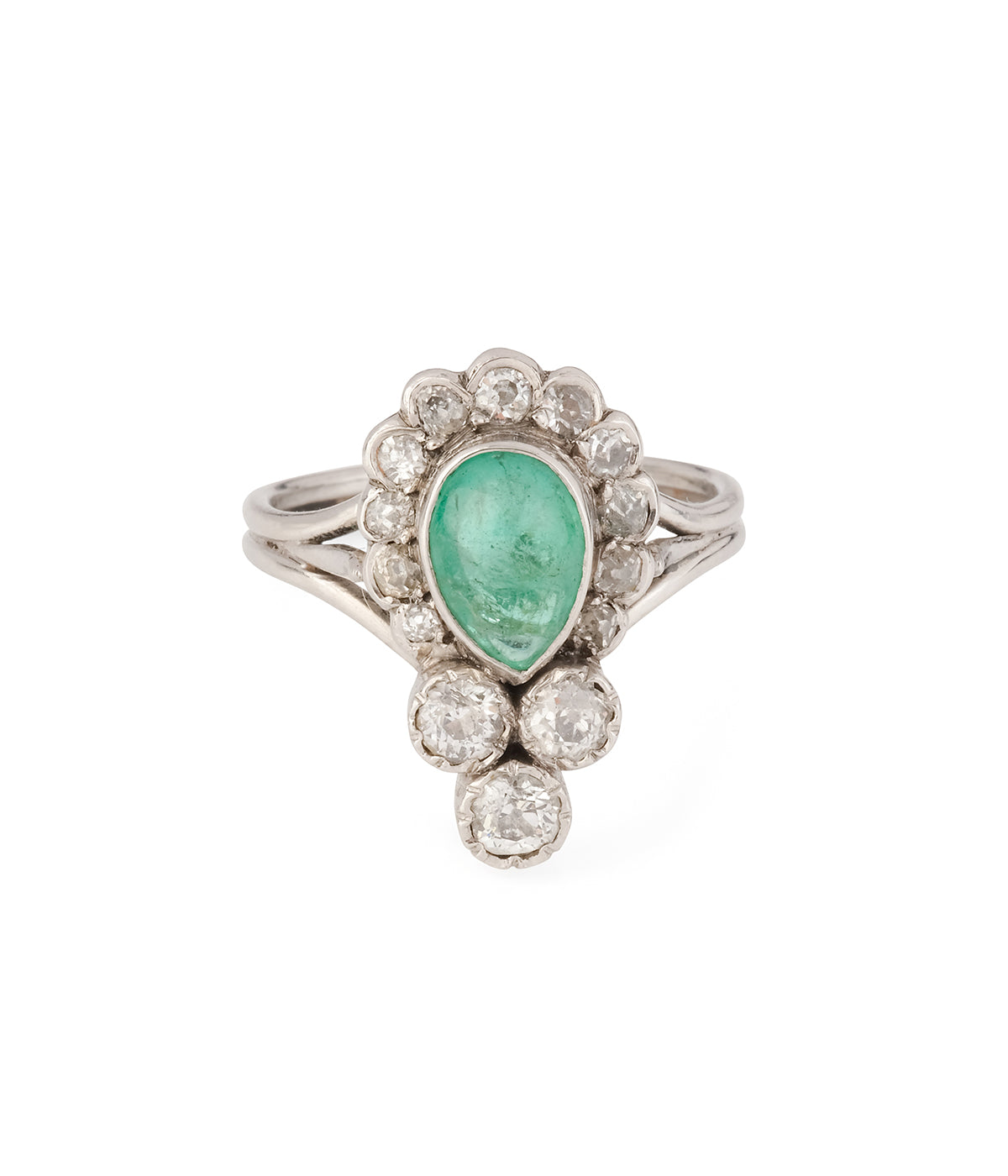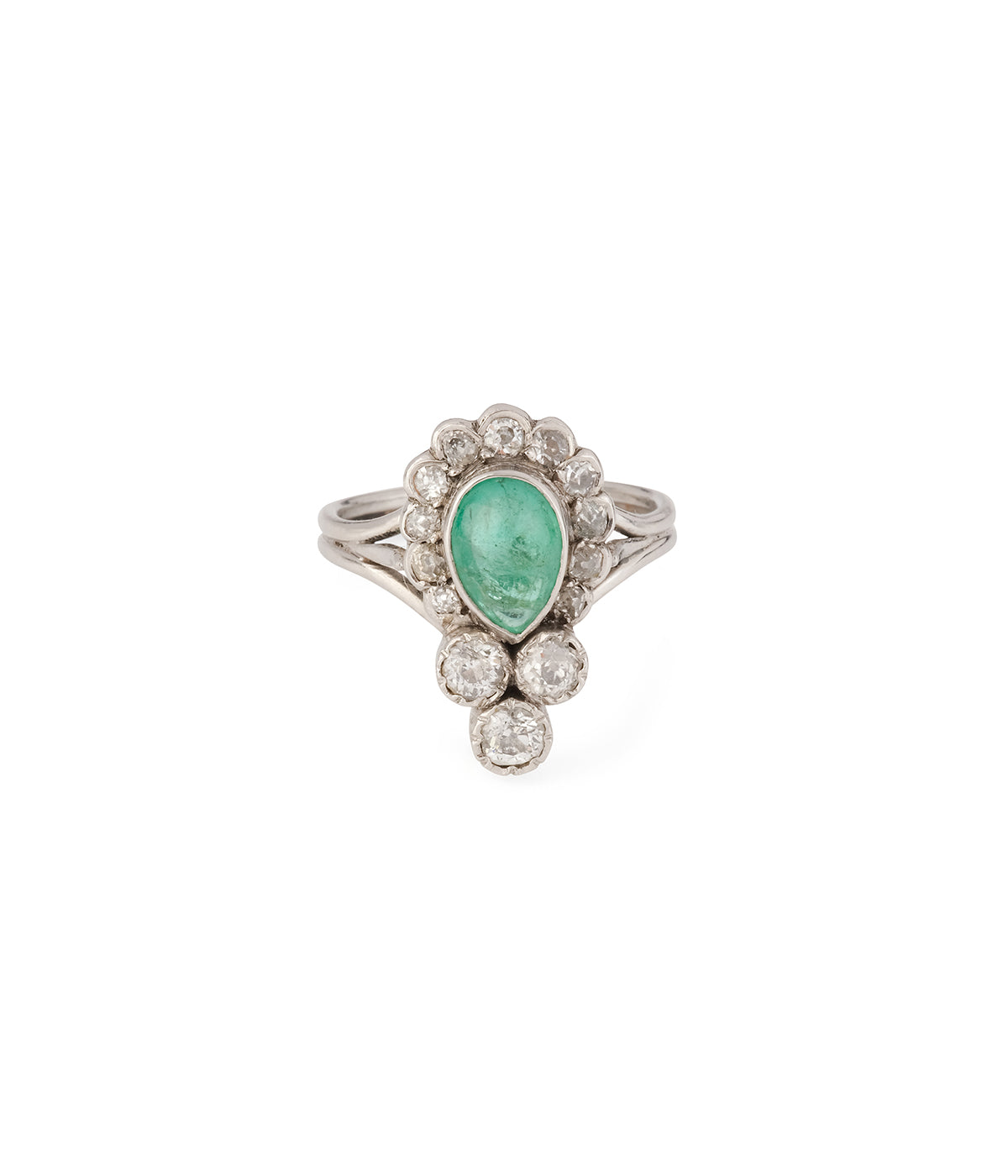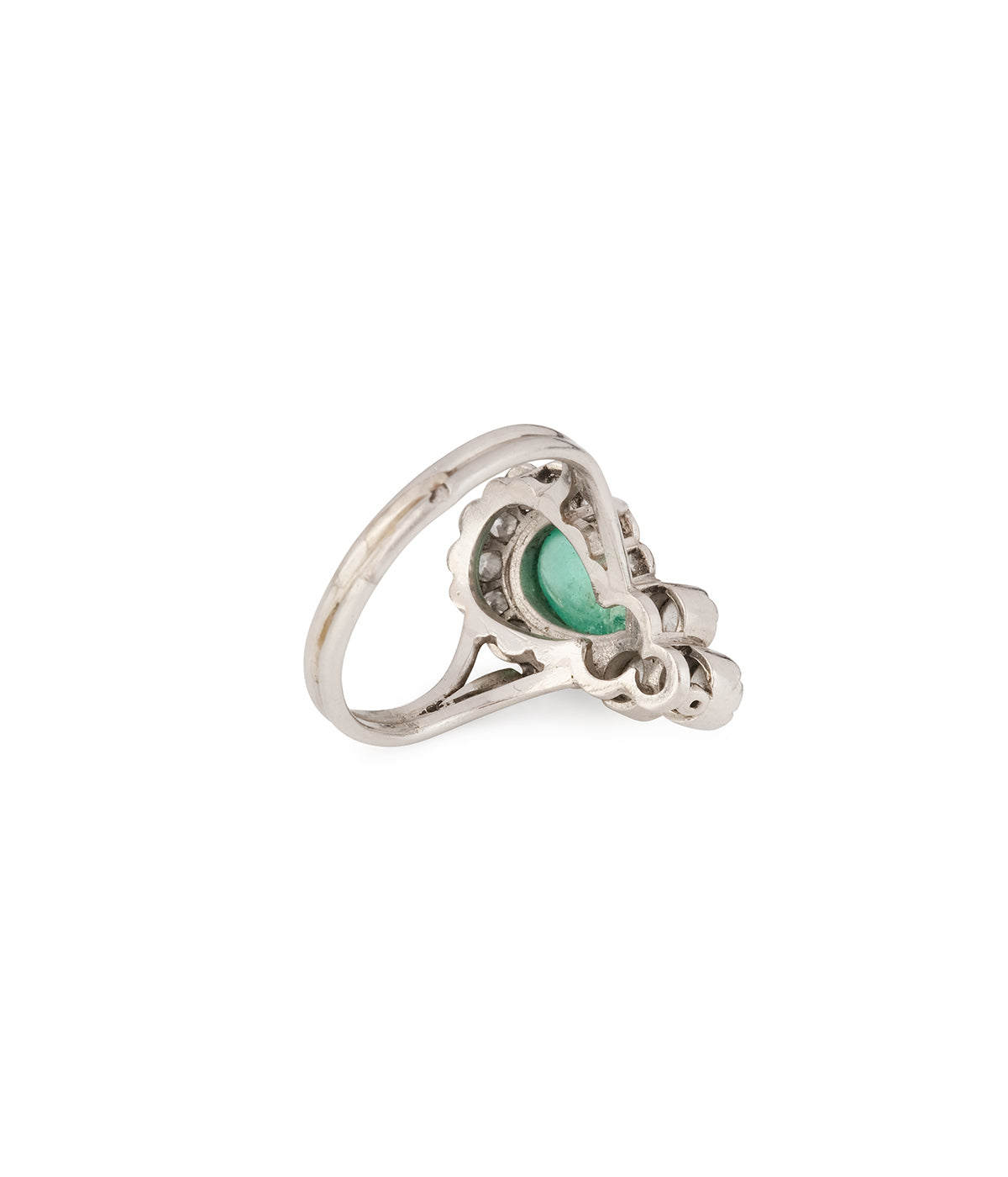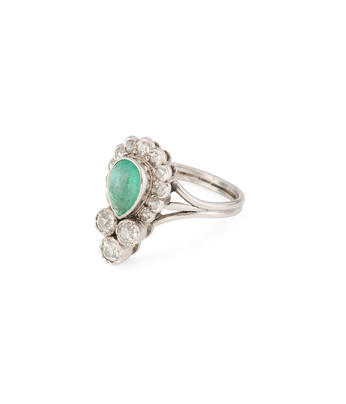 Bague Duchesse ancienne en platine du début du 20ème siècle. Elle est ornée en son centre d'un cabochon d'émeraude taillé en poire et pesant environ 0,90 carat. Celle-ci est surmontée à sa pointe de trois diamants taille ancienne totalisant environ 0,80 carat. Son arrondi est soulignée de onze diamants taille rose.