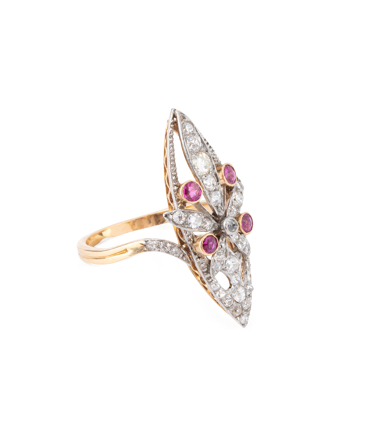 Bague marquise ancienne en or 18 carats (750 millièmes) et platine du début du 20ème siècle. Le plateau est repercé d'un motif de feuille entièrement serti de diamants taille ancienne et petits rubis ronds.