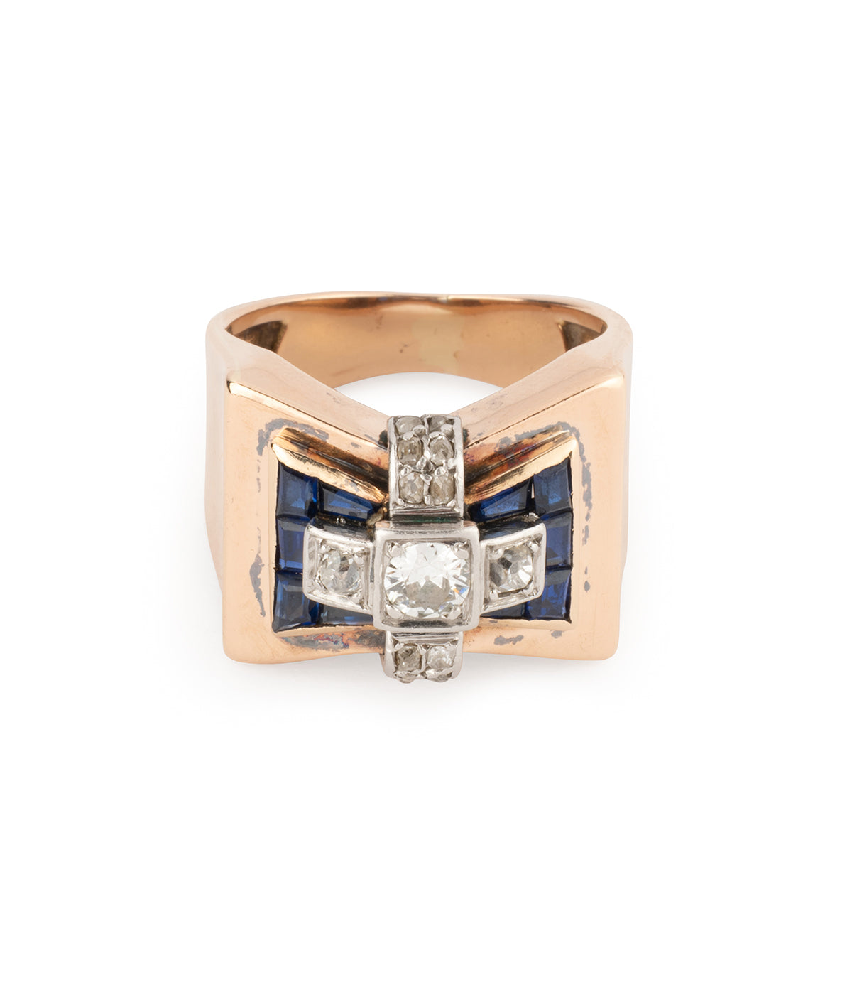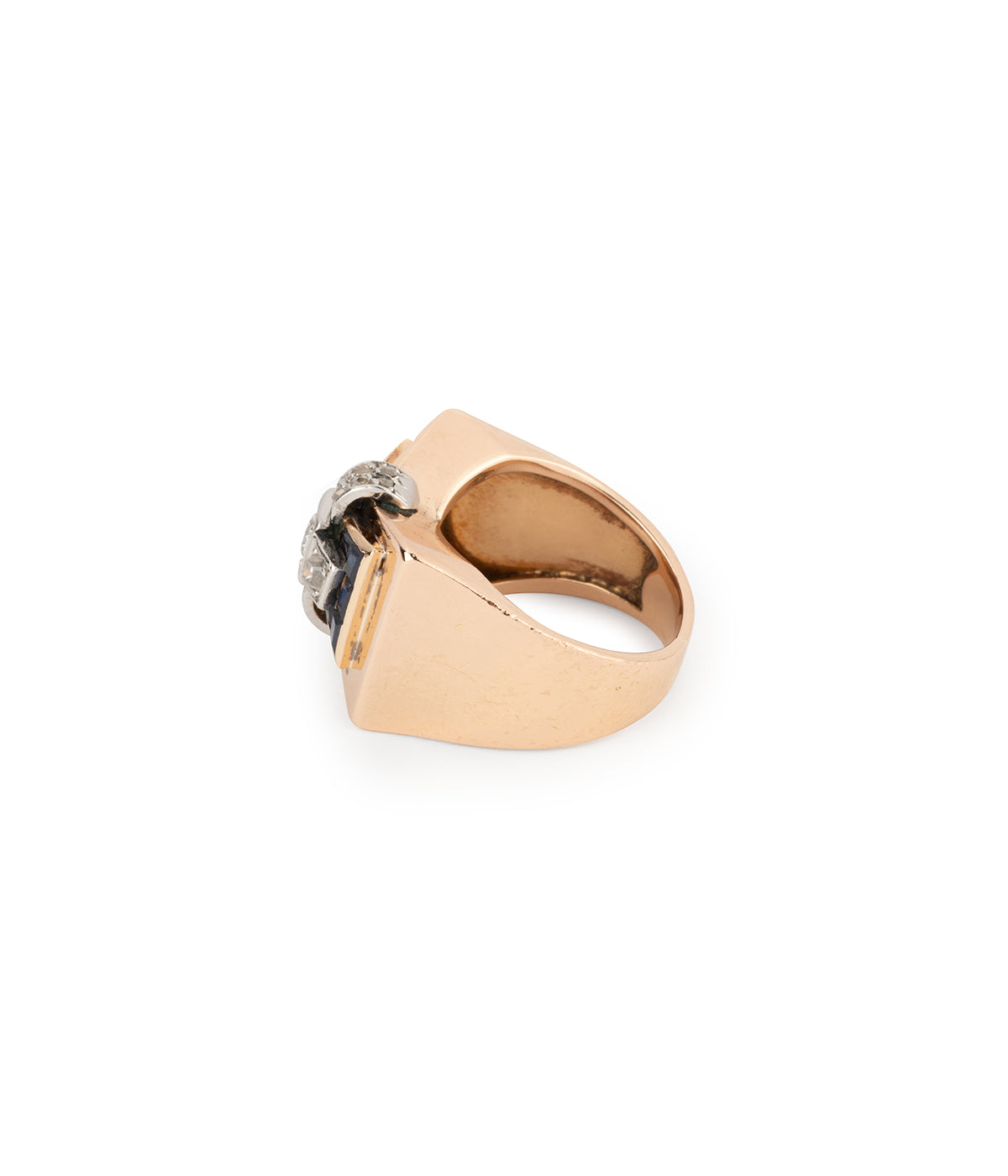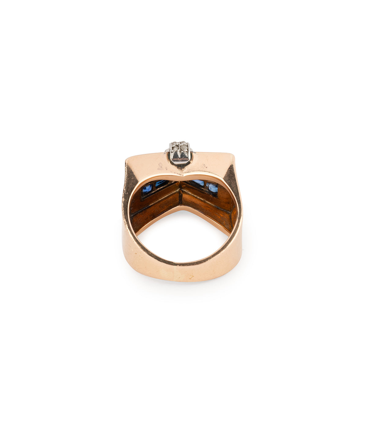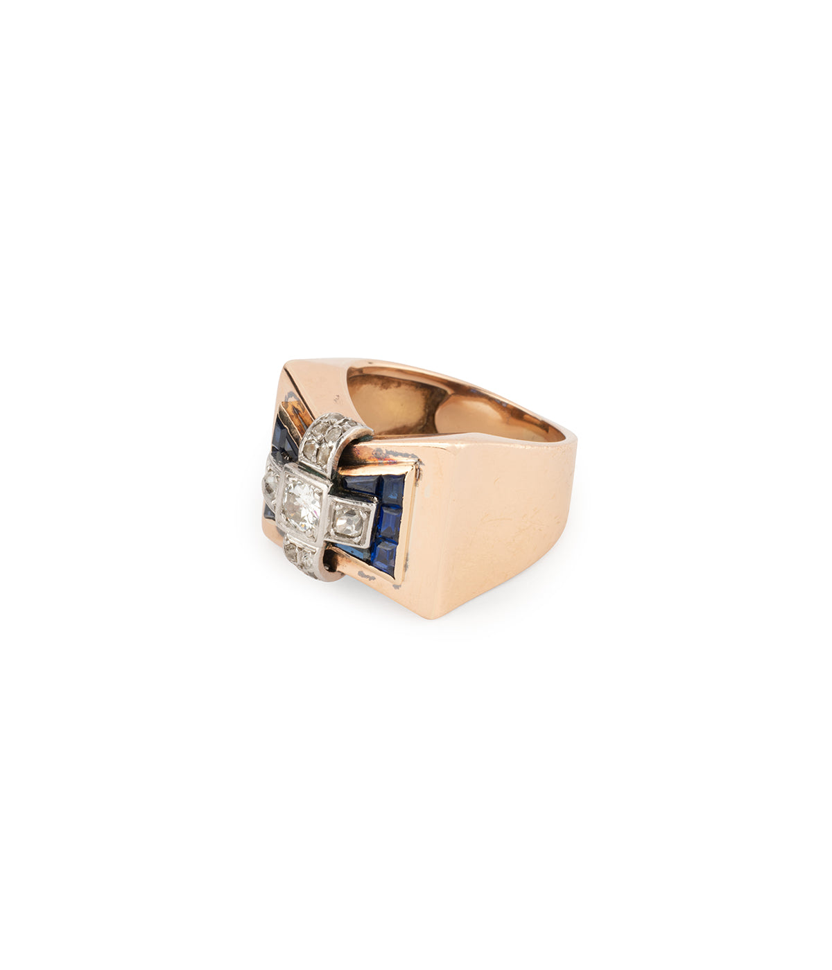 Bague Tank en or rose 18 carats (750 millièmes) et platine. De forme "noeud", elle est rehaussée au centre d'un diamant de taille ancienne pesant env. 0.25 carat et est épaulé de diamants taille ancienne et de saphirs synthétiques calibrés.