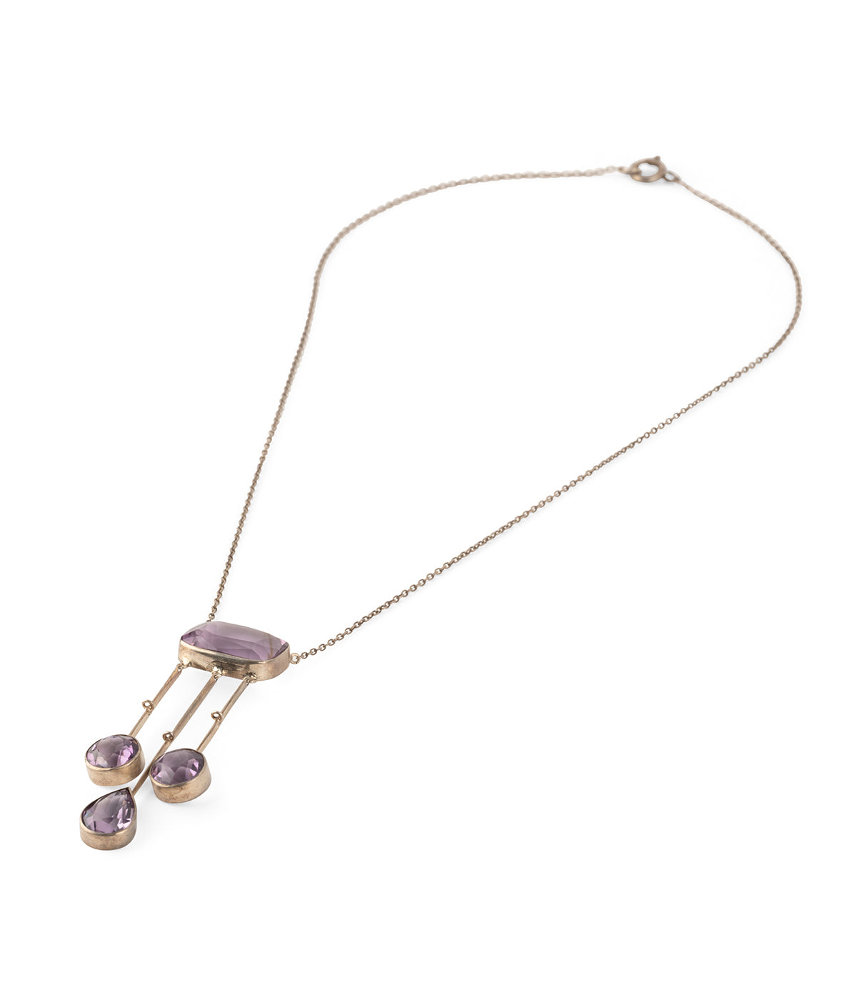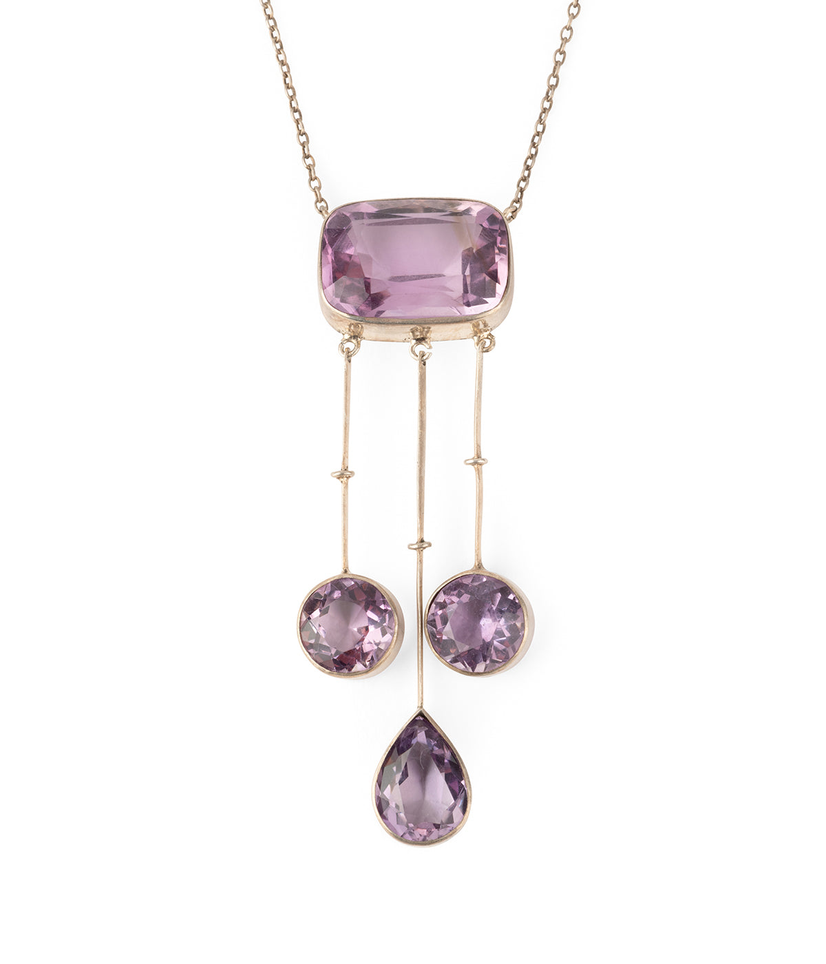 Collier négligé ancien en argent du début du 20ème siècle, composé d'une améthyste taille rectangulaire retenant en pampille deux améthystes taille ronde et une améthyste au centre taille goutte.