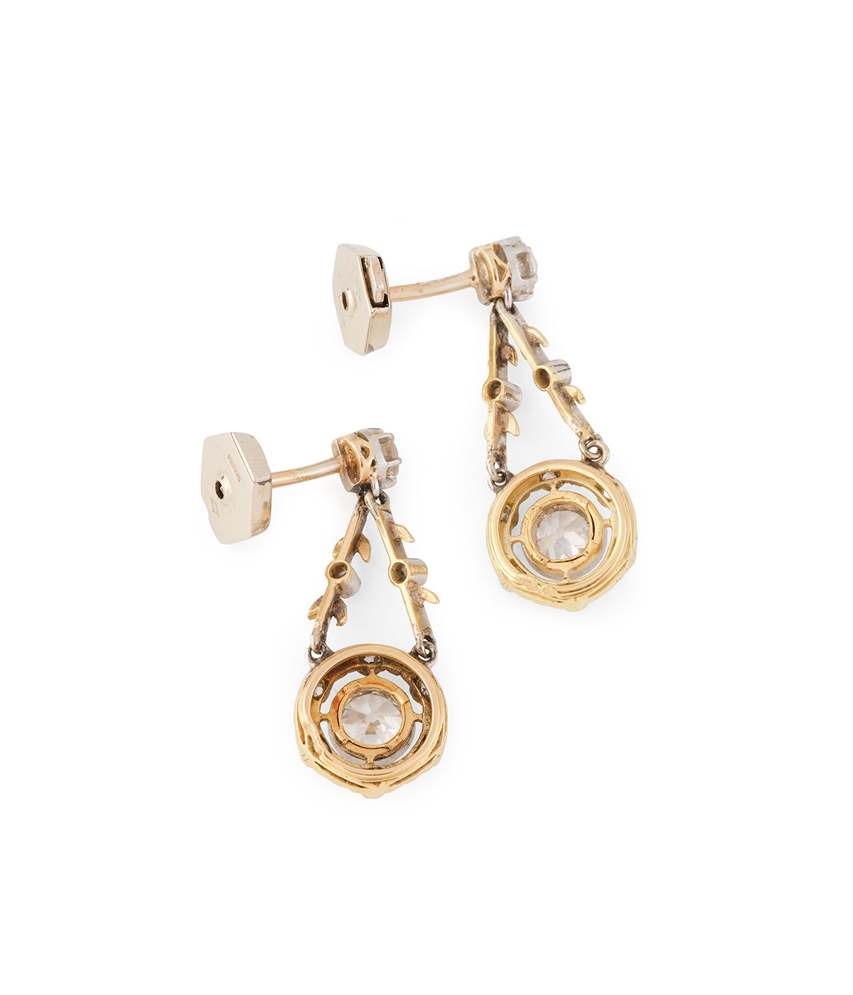 Boucles d'oreilles Belle époque en or blanc et jaune 18 carats (750 millièmes), Elles sont formées d'un clou rehaussé d'un diamant taille ancienne de 0,15 carat environ et retenant un diamant taille ancienne d'environ 0,55 carat entouré de motifs de feuillages et de diamants taille rose serti perlé.
