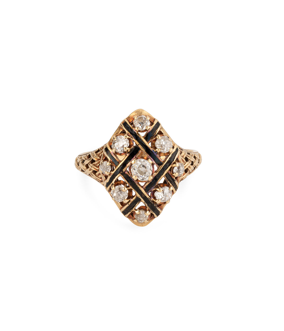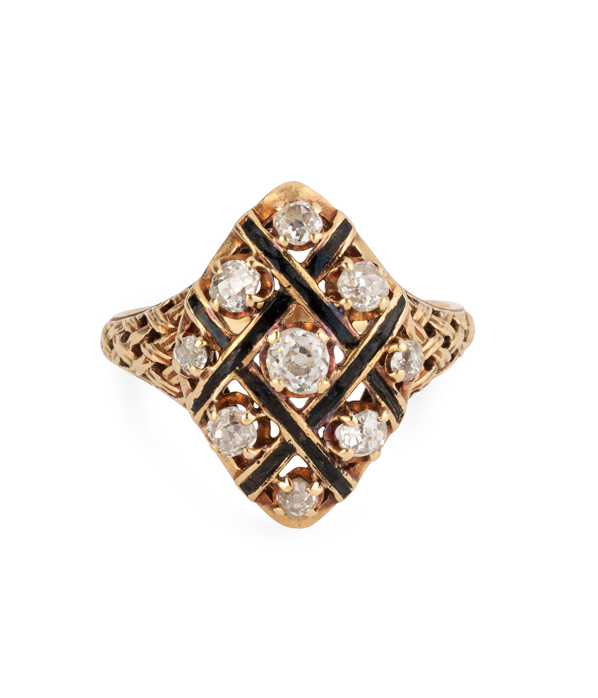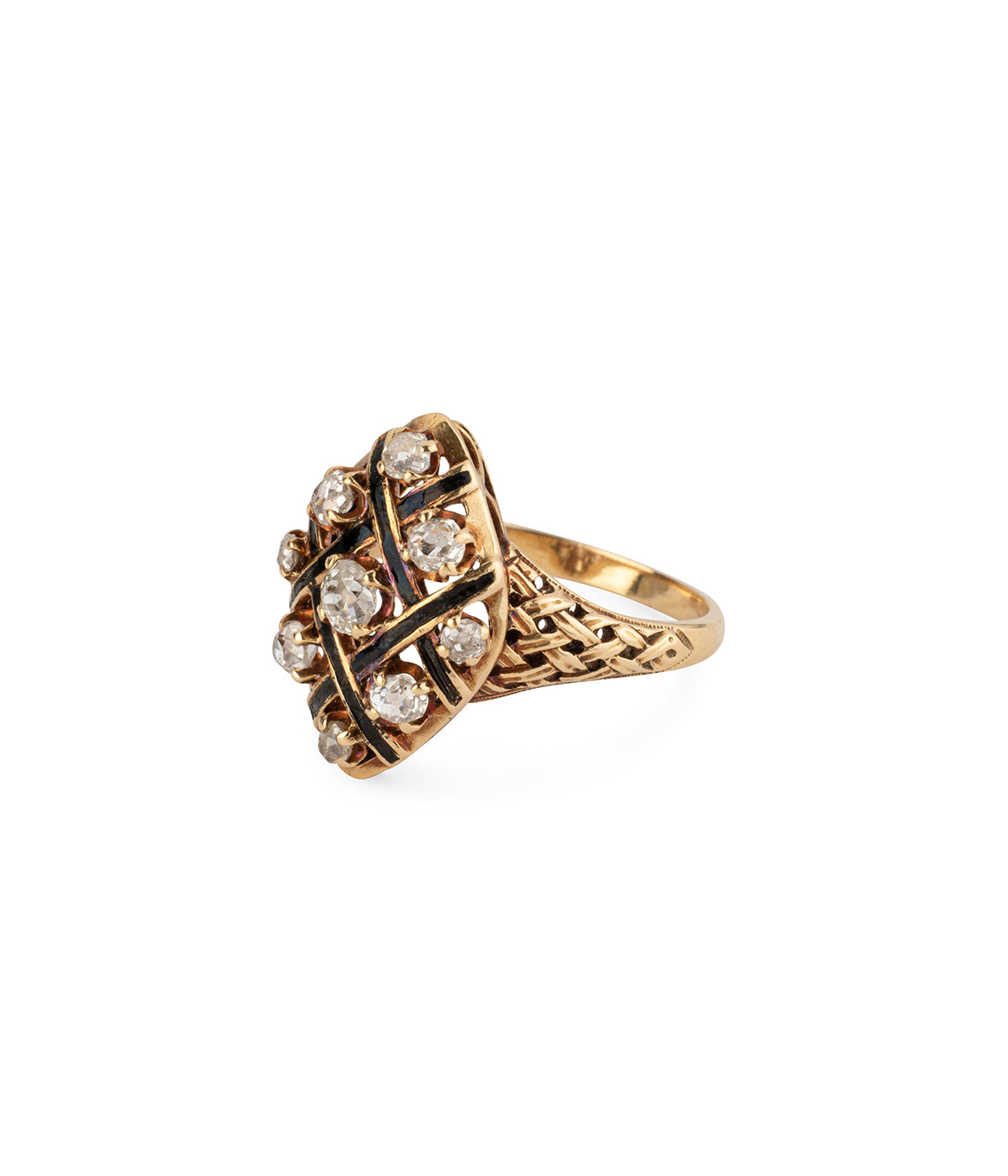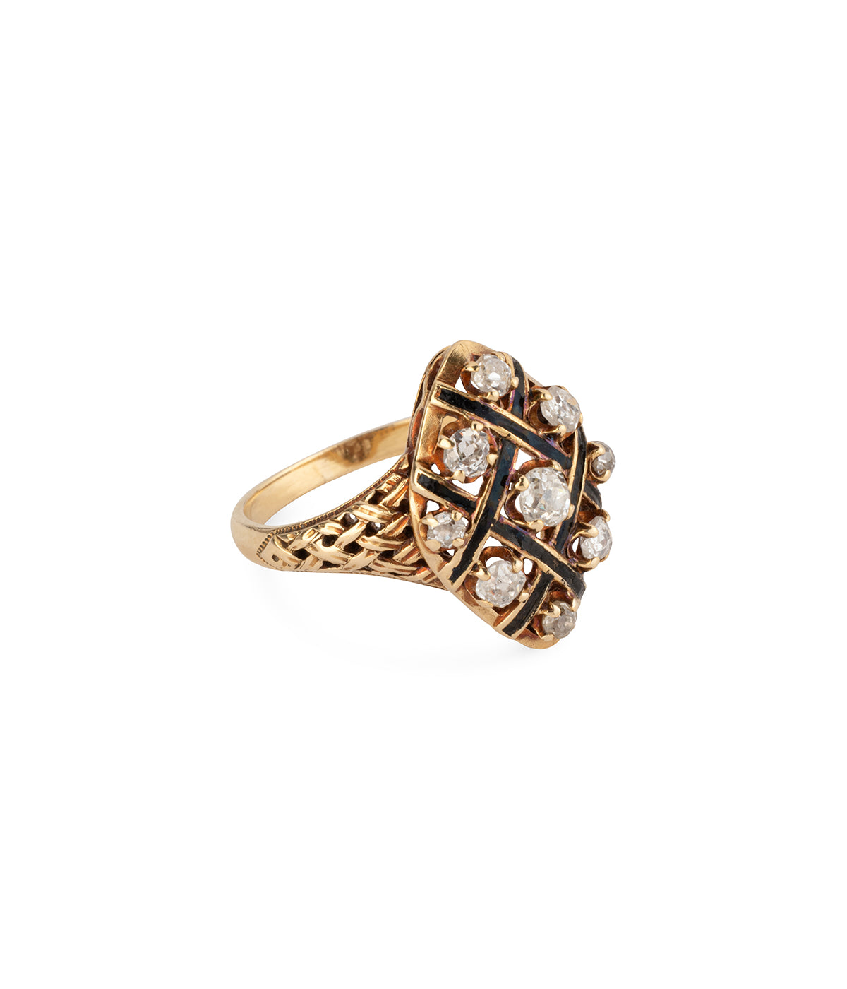 Bague Marquise ancienne en or 18 carats (750 millièmes) du milieu du 19ème siècle. Elle est ornée de six diamants taille ancienne disposés dans un quadrillage d'émail noir. À noter les épaulements imitant un tissage.