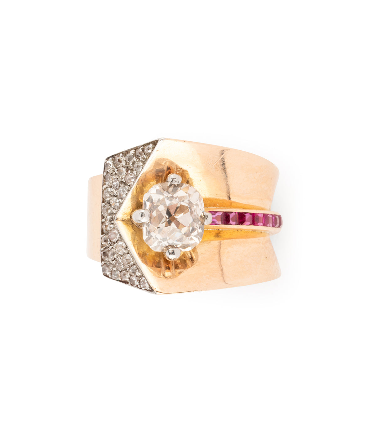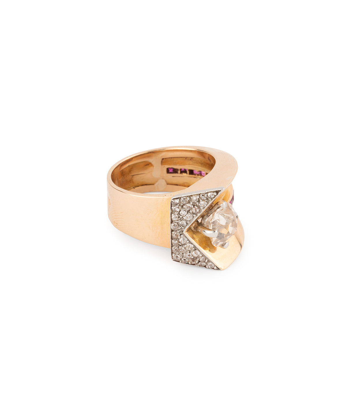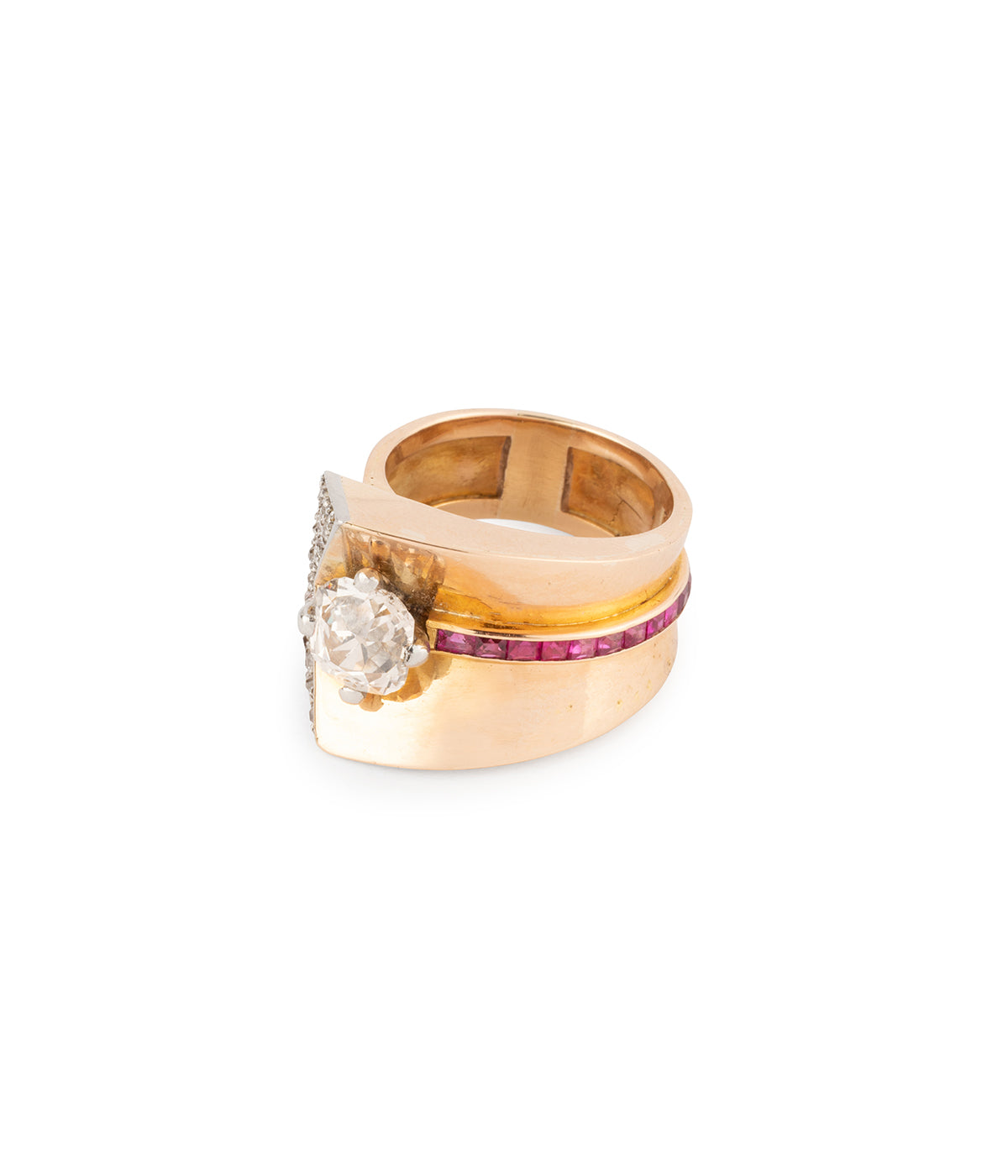 Bague Tank en or rose 18 carats (750 millièmes). En forme de V, elle est ornée d'une ligne de rubis se terminant par un diamant taille coussin ancienne 1,51 carats (Couleur L - Pureté SI2). La tranche de cette ligne est pavée de diamants taille ancienne.