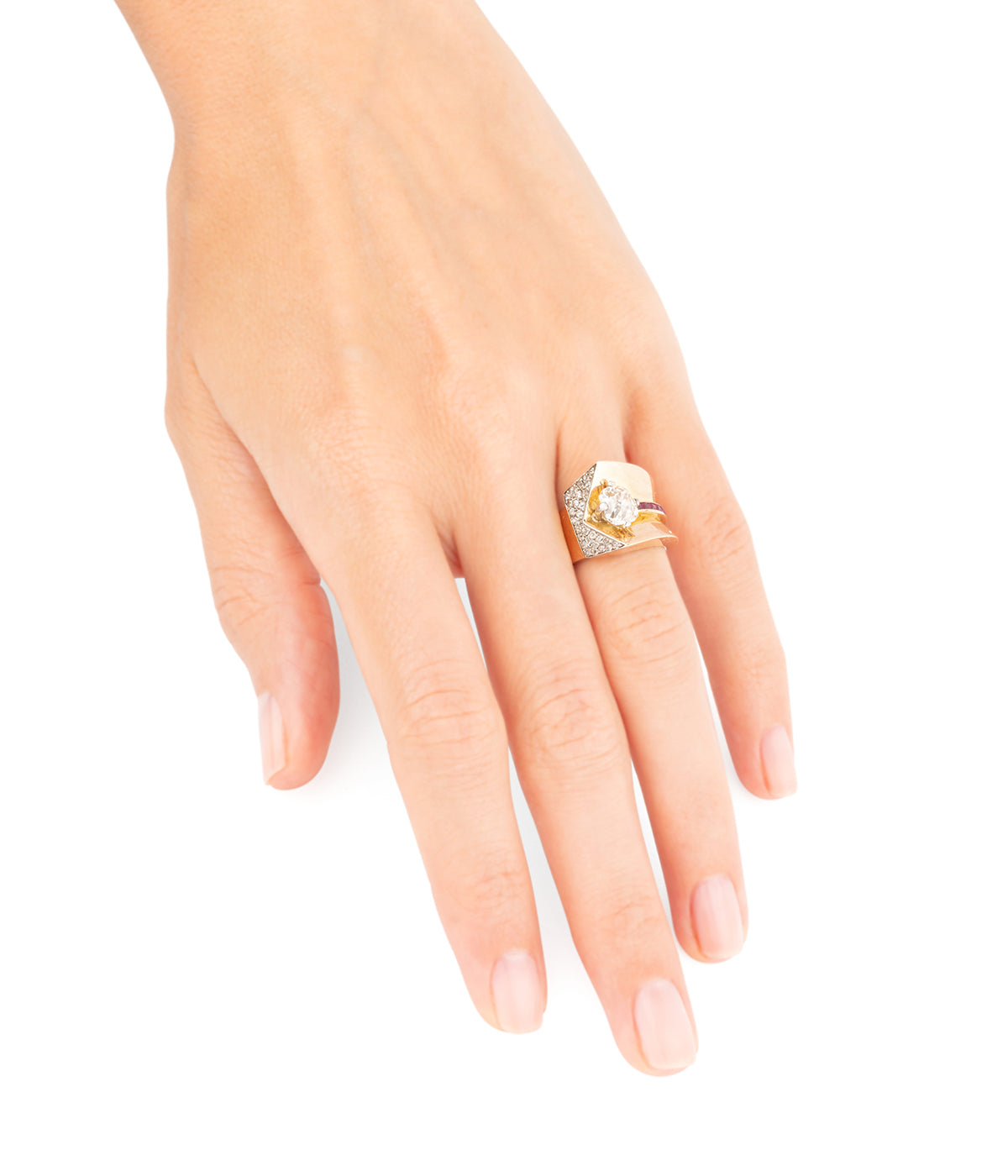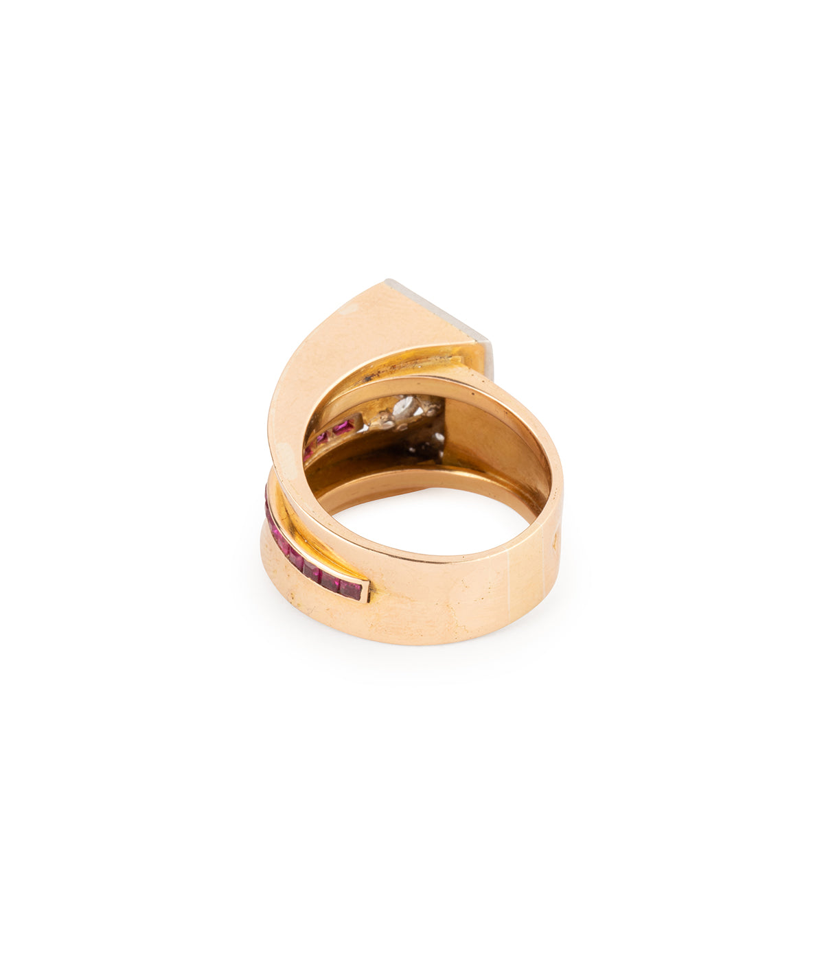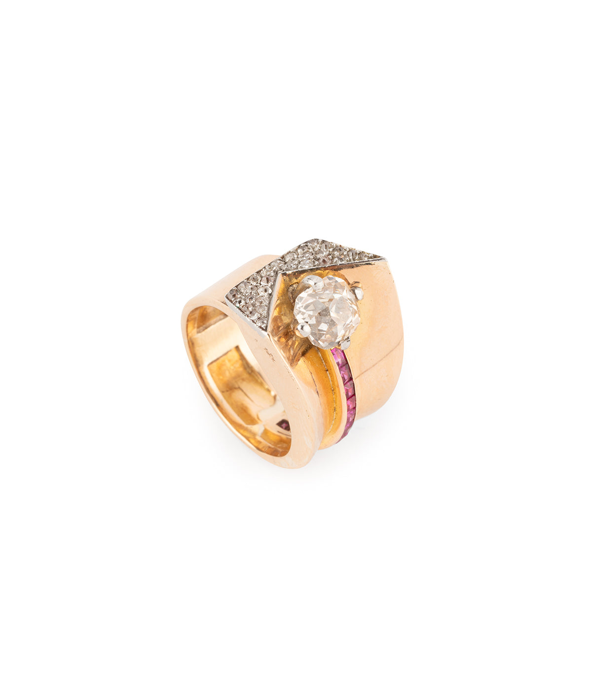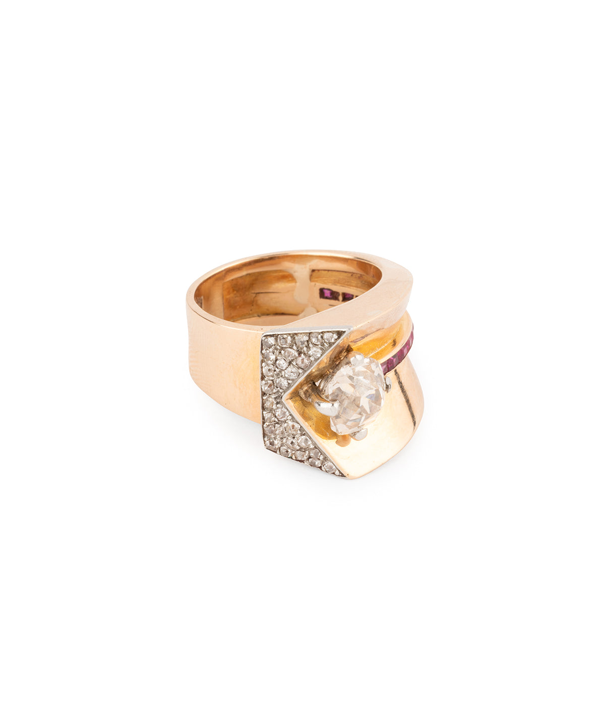 Bague Tank en or rose 18 carats (750 millièmes). En forme de V, elle est ornée d'une ligne de rubis se terminant par un diamant taille coussin ancienne 1,51 carats (Couleur L - Pureté SI2). La tranche de cette ligne est pavée de diamants taille ancienne.