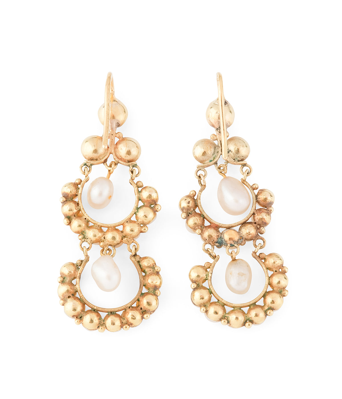 Pendants d'oreilles anciens en or 14 carats (585 millièmes) de la fin du 19ème siècle. Ils sont composés de trois éléments. La partie supérieure est ornée de 3 perles et disposées en trèfle. Elle retient les deux éléments inférieurs, mobiles. En demi-cercle, ils sont soulignés de perles et centrés d'une perle en pampille.