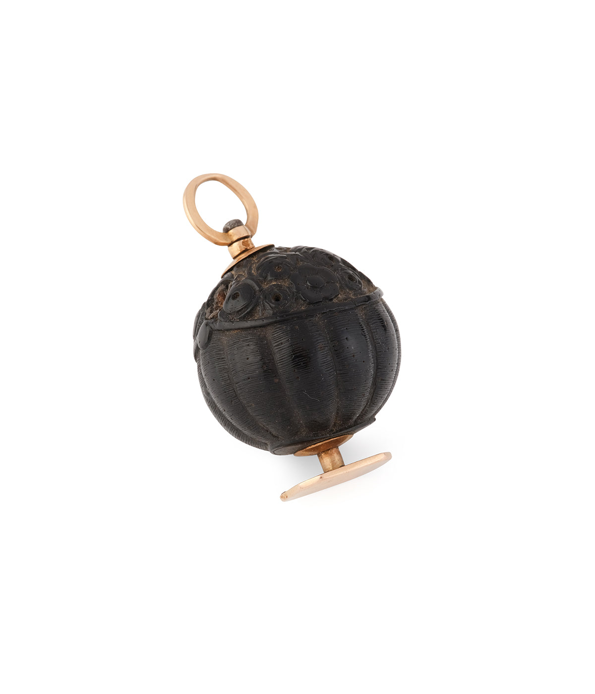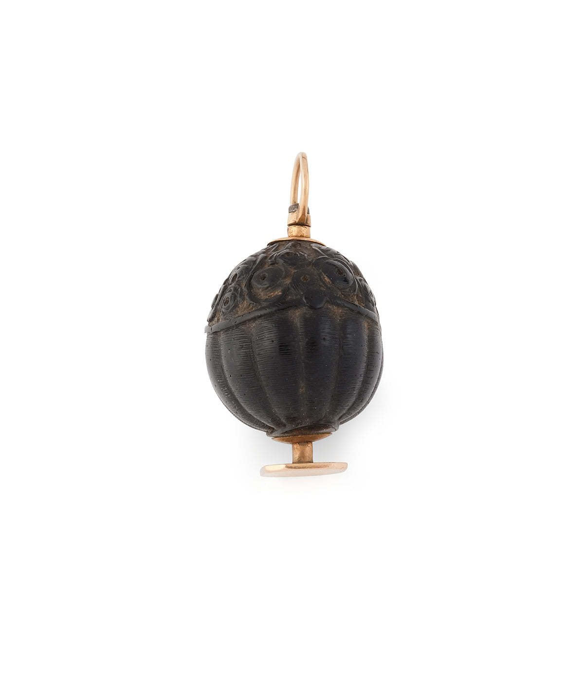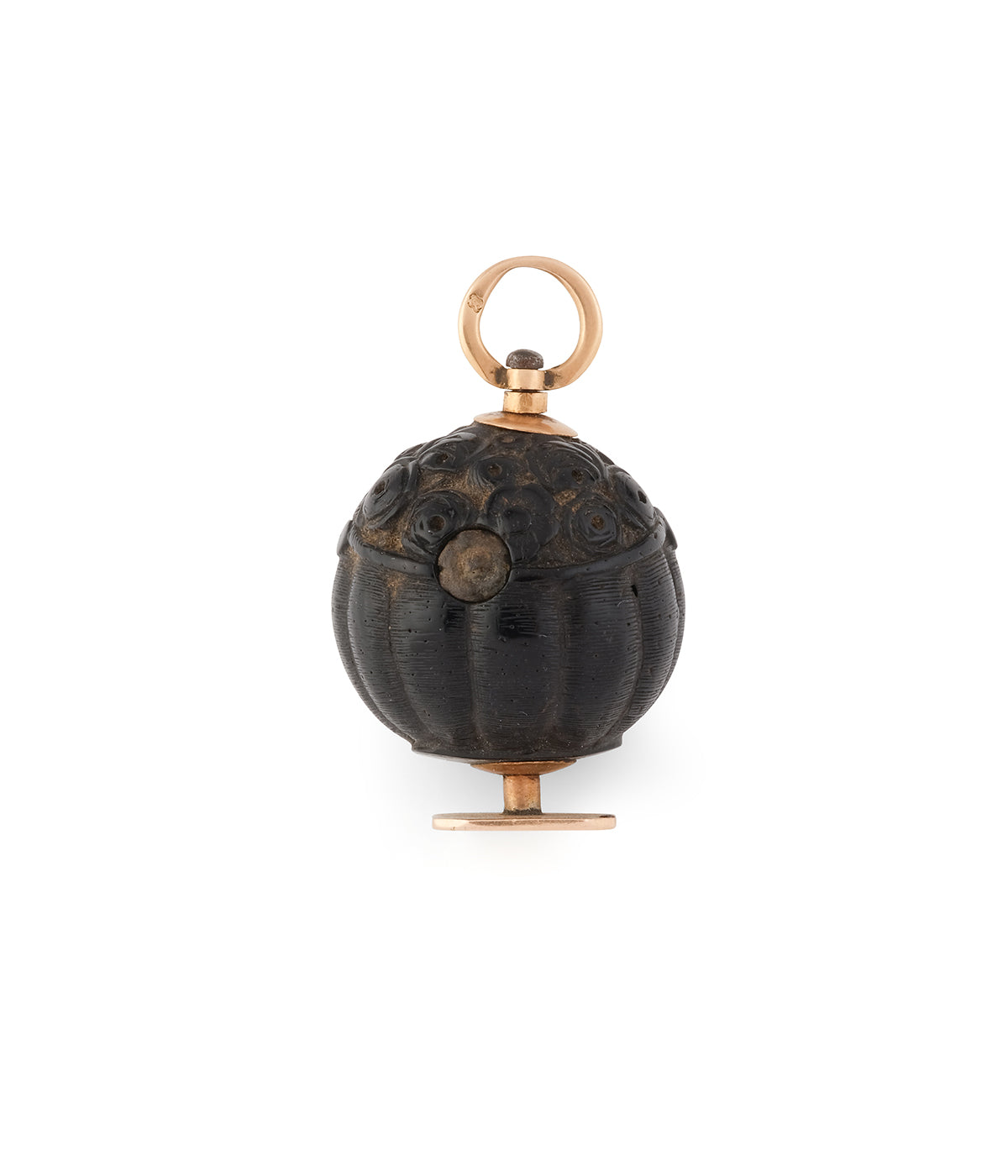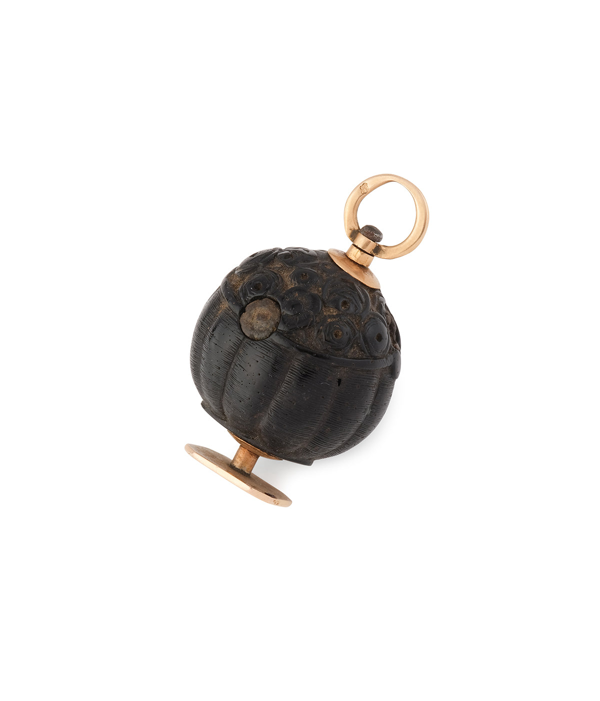 Pendentif ancien en or rose 18 carats (750 millièmes) du début du 19ème siècle. Le corps de ce sceau est en corozo. Aussi appelé « ivoire végétal », il s’agit en fait des fruits d’un palmier de la forêt amazonienne dont la chair intérieure devient très dure en séchant, ce qui permet de la travailler comme l’ivoire pour en faire de petits objets gravés. Ici, la noix est gravée de motifs le faisant ressembler à un panier de fleurs. À noter que le plateau est vierge.