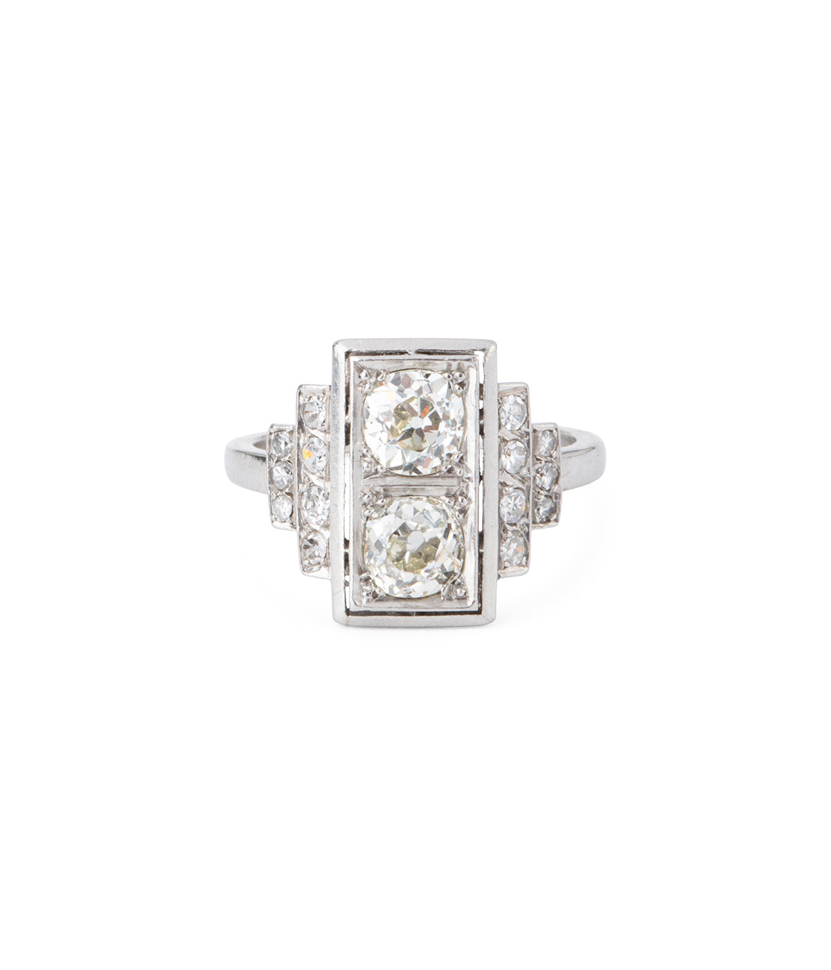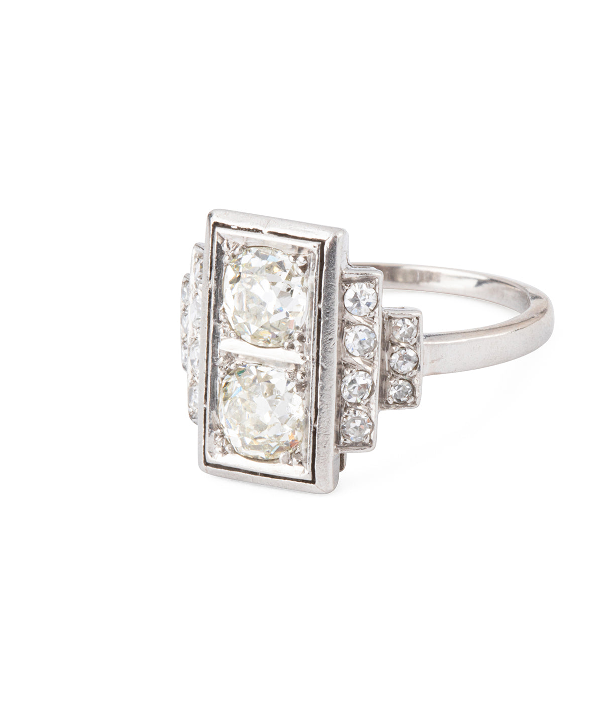Bague Art déco en platine, centrée de deux diamants taille ancienne d'env. 0,80 chacun (couleur estimée K, pureté estimée VVS1 et I1) en serti perlé. Les épaulements en escalier sont rehaussés de diamants taille 8/8.