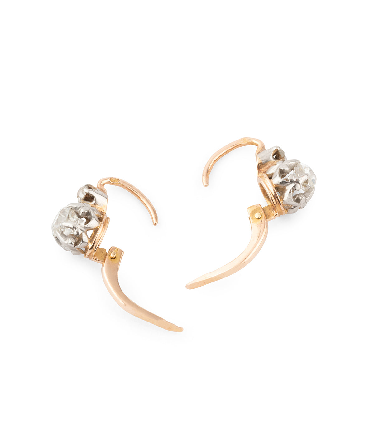 Dormeuses anciennes en platine et or rose 18 carats (750 millièmes) du début 20ème siècle en or rose et platine. Elles sont ornées d'un diamant taille rose et coussin ancienne (l'une de 0,5 carat environ et l'autre de 0,4 carat environ).