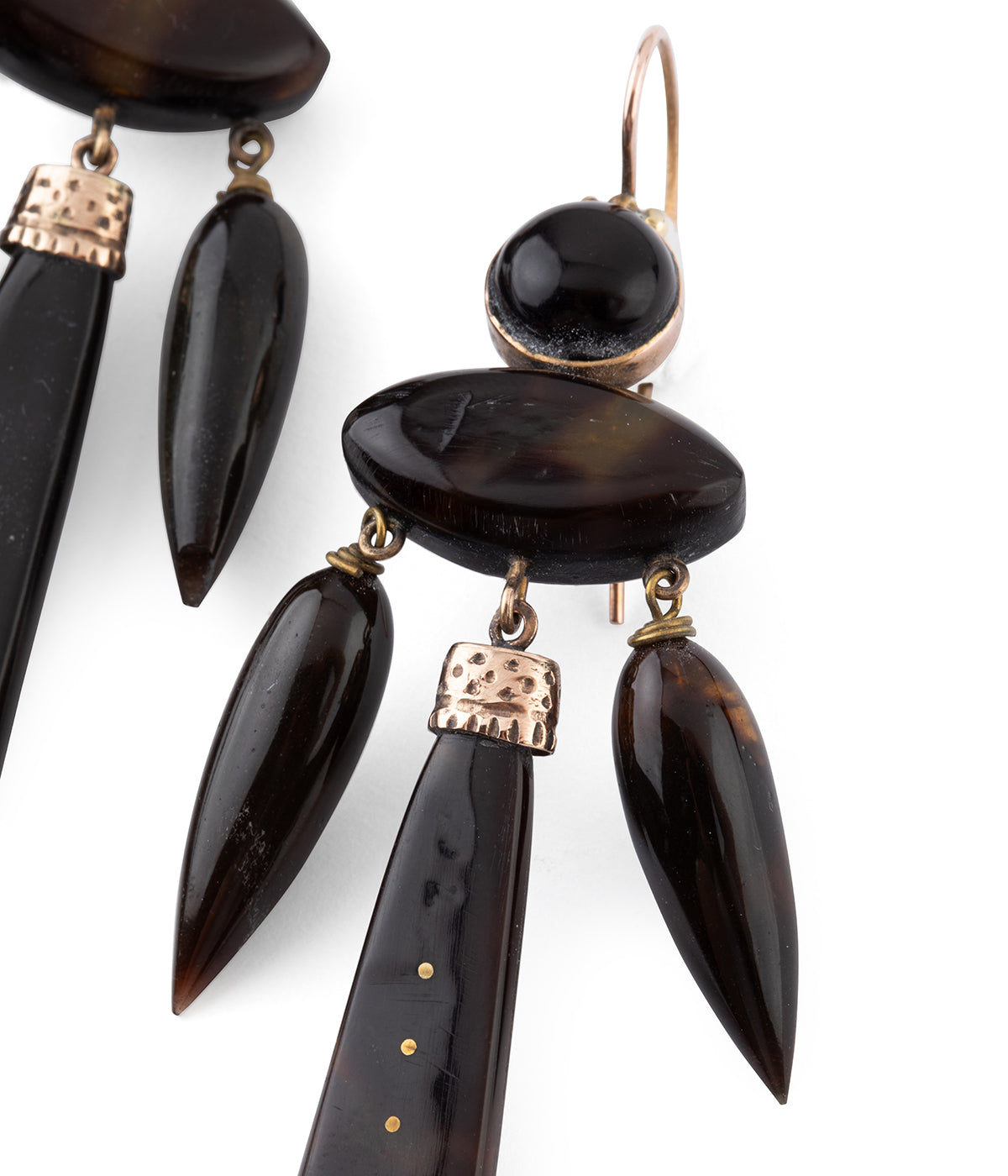 Pendants d’oreilles anciens de style girandole, en piqué sur écaille de tortue incrustée de métaux de la fin du 19ème siècle.
