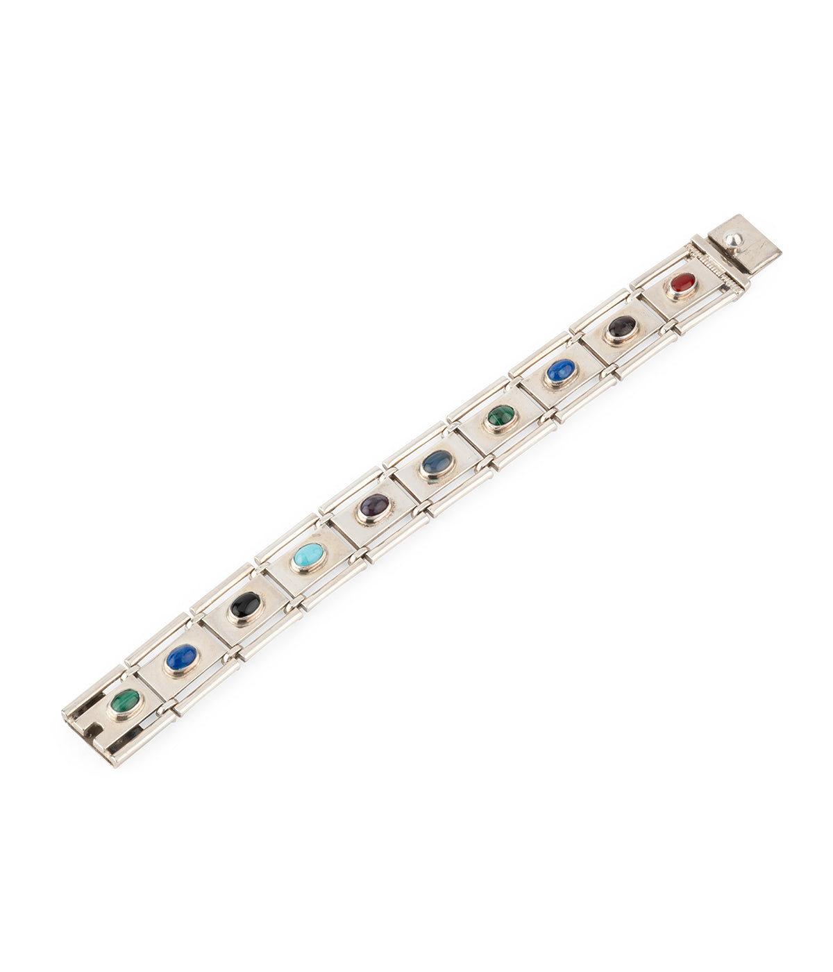 Bracelet vintage en argent 925 d'origine mexicaine composé de plaques ornées, chacune, d'un cabochon de pierres dure ou fines (turquoise, malachite, calcédoine, cornaline…). Le collier assorti est disponible ici !